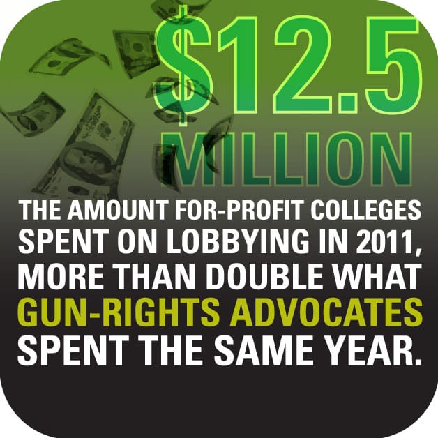 Read more$12.5 million: The amount for-profit colleges spent on lobbying in 2011, more than double what gun-rights advocates spent the…