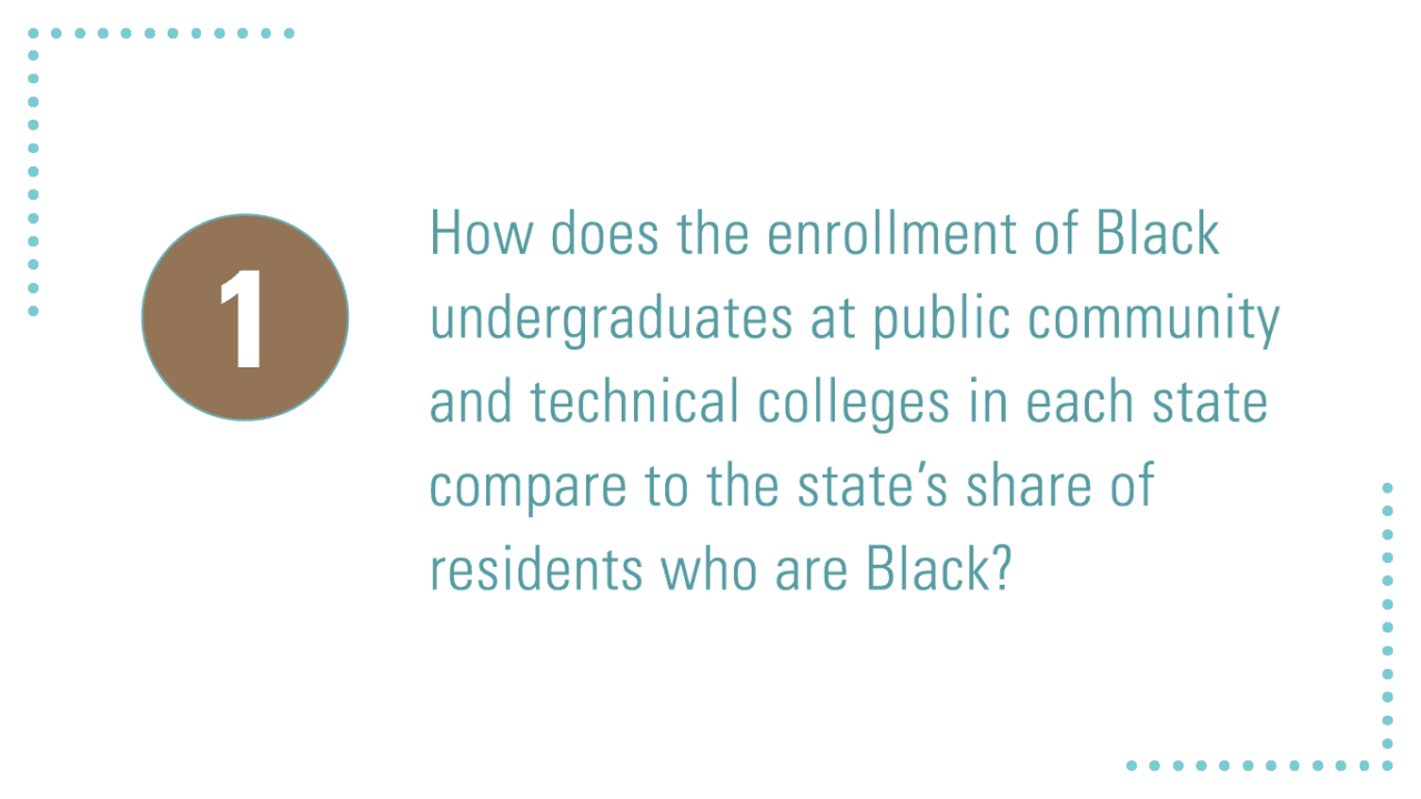 - In roughly half of the 41 states, Black enrollment at community and technical colleges fails to reflect the state’s racial composition of Black residents.